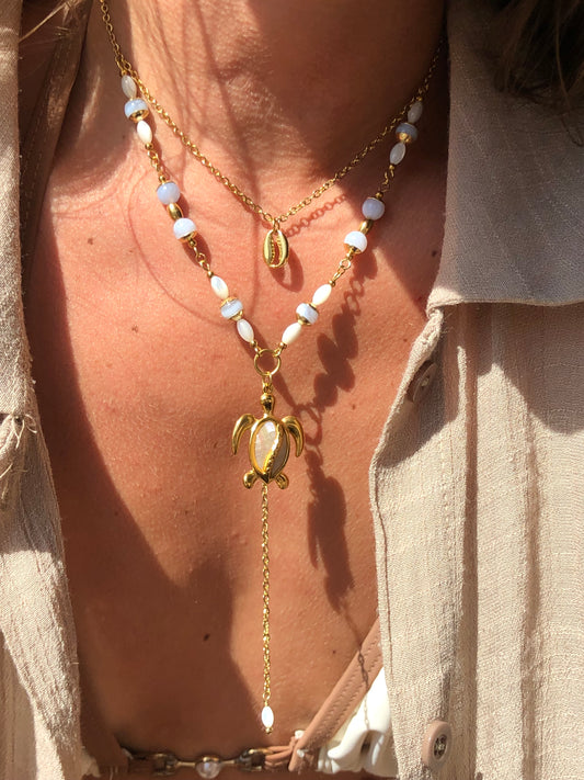 Colliers thème Océan, Calcédoine bleue & perles nacrées