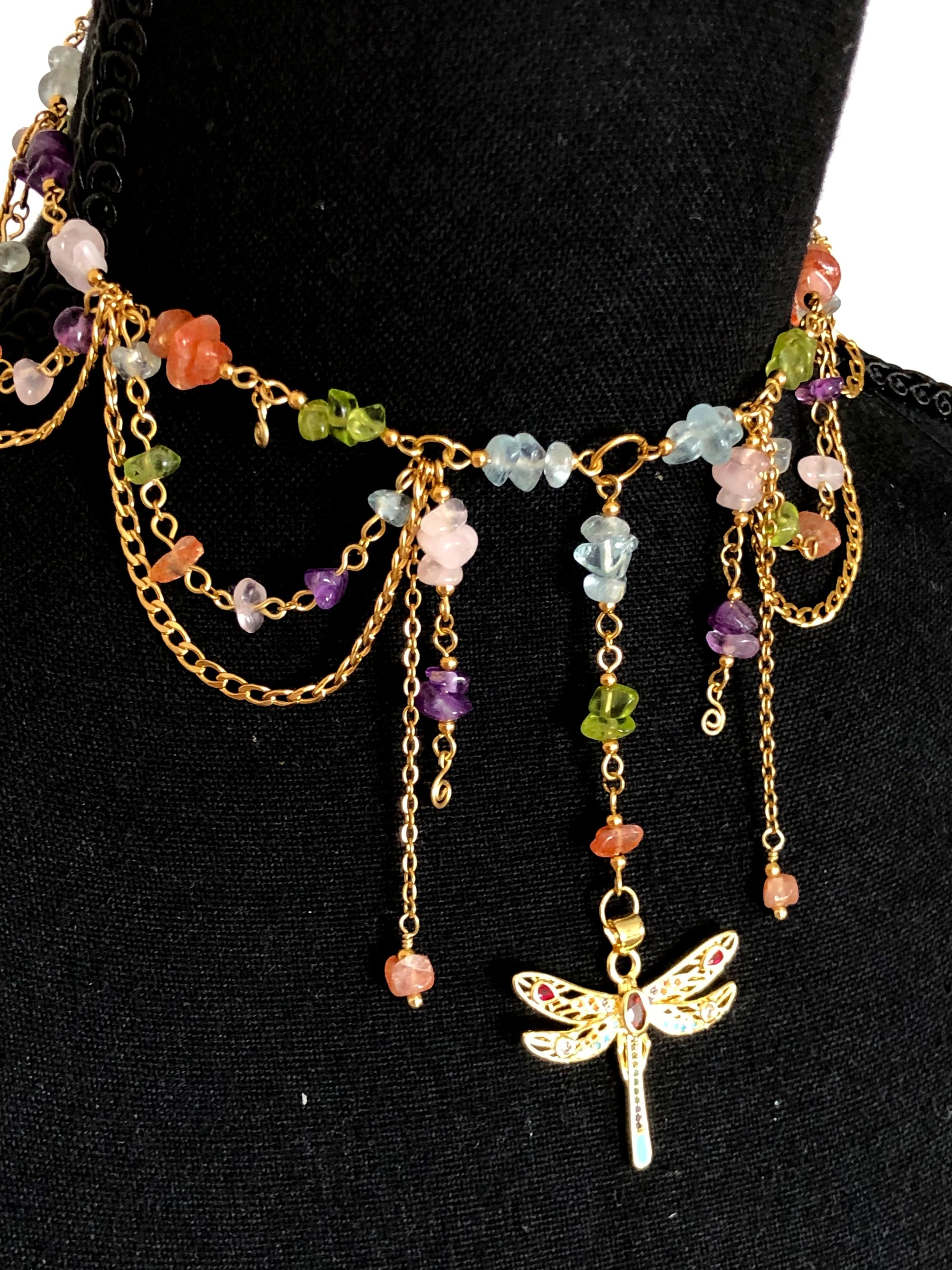 Ce collier est une alchimie subtile entre cinq pierres soigneusement sélectionnées : péridot, aigue-marine, améthyste, pierre de soleil et quartz rose.